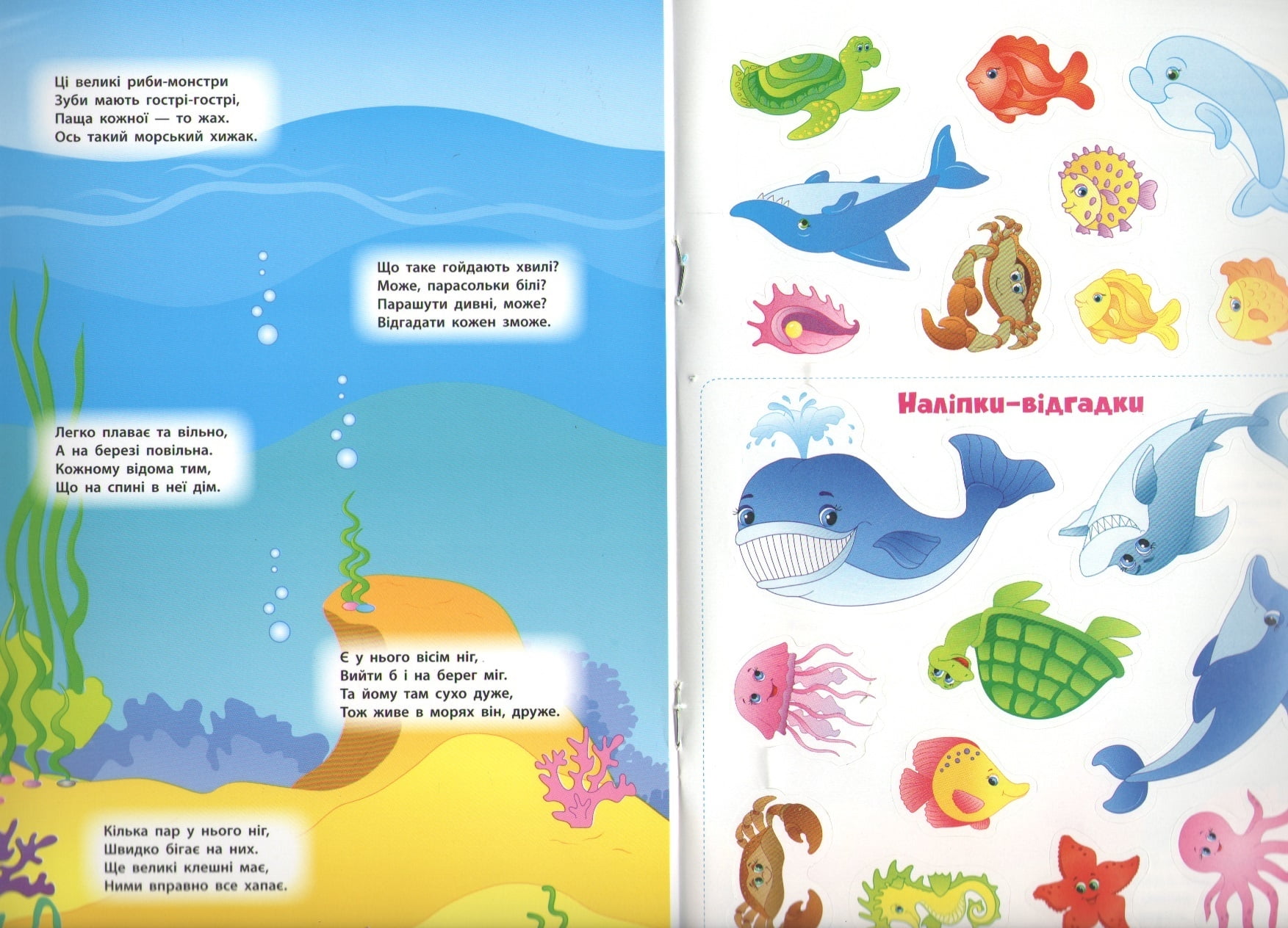 Це видання призначене для розвитку дрібної моторики, уваги, уяви та кмітливості малюків. Загадки у віршах спонукатимуть дитину шукати відповіді серед наліпок і клеїти їх до білі ілюстрованої панорамки.