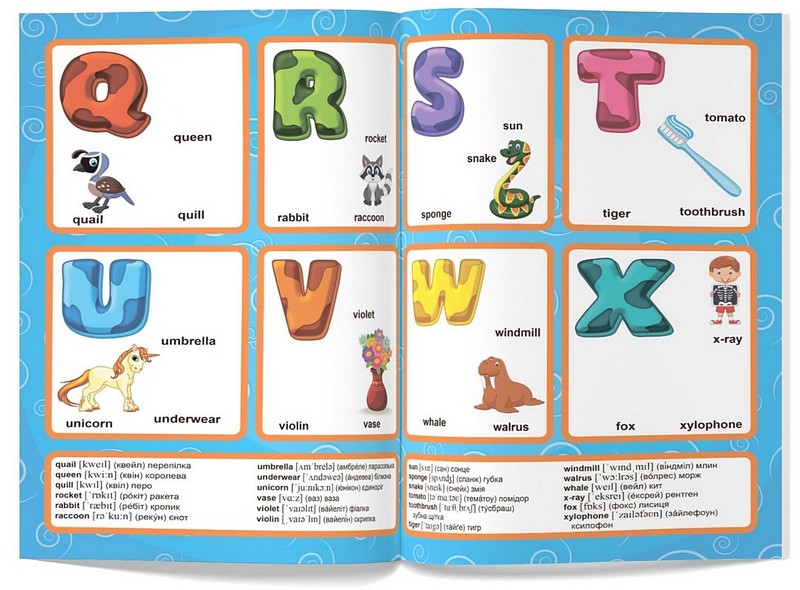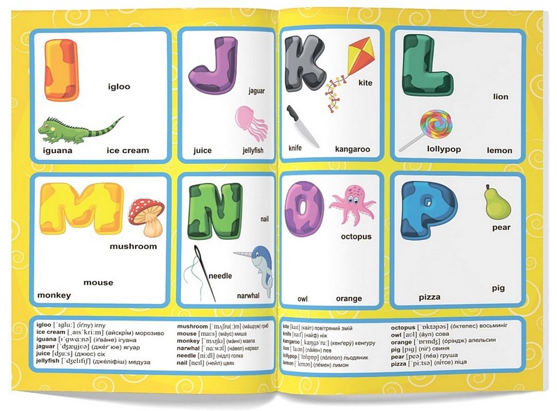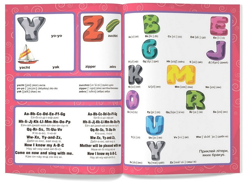 Хутчіш зазірни в книжку, щоб познайомитися з літерами англійського алфавіту. Ти дізнаєшся, як вони пишуться, й вівчіш нові англійські слова. А допоможуть тобі в цьому 65 барвистих розвивальних наліпок. Використовуй як підказку зазначені поруч Із ними номери сторінок.