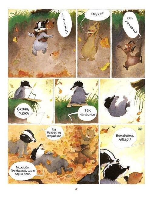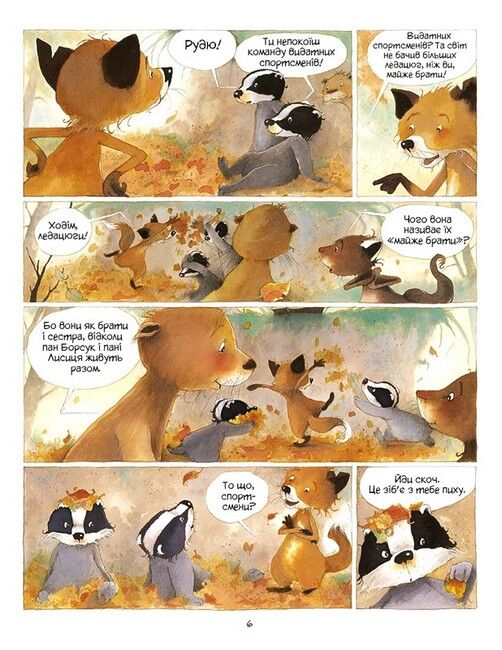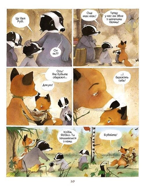 Лисичка Рудя та її мама Маргарита, а також борсученята Кусь, Гризь і маленька Ягідка та їхній тато Едмон живуть однією сім’єю після того, як лисячу нору зруйнували мисливці. І хоча лисиці й борсуки дуже різні — лисиці полюбляють безлад, вони швидкі та метушливі, а борсуки повільні та розважливі і понад усе цінують порядок, — це не заважає їм ставитися з повагою одне до одного. Цей комікс — про дружбу між дітьми, про бажання співпраці та порозуміння, про те, як важливо не лише залишатися собою, а й уміти почути інших.