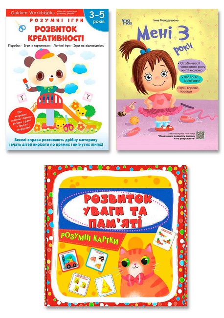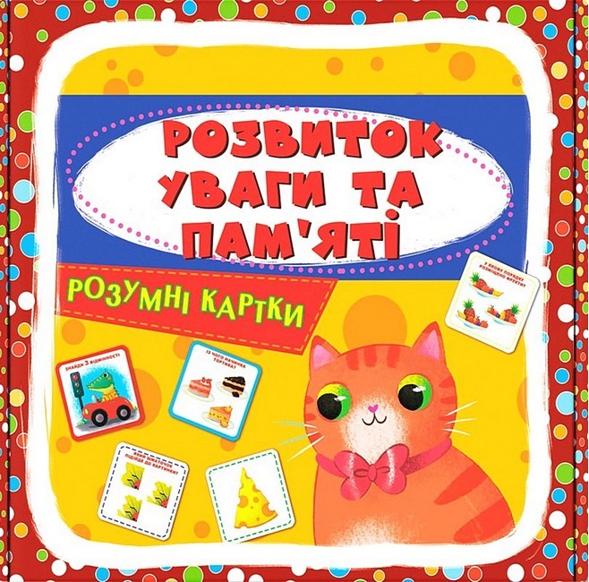 Набір «РОЗВИТОК УВАГИ ТА ПАМ'ЯТІ» складається з 30 карток і 5 типів завдань, що відрізняються за складністю. Цей навчально-ігровий комплект призначено для розвитку в дитини логічного мислення, мови й мовлення, розширення словникового запасу, тренування пам'яті та здатності концентрувати увагу.