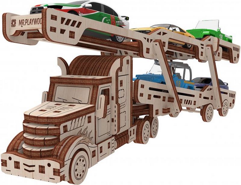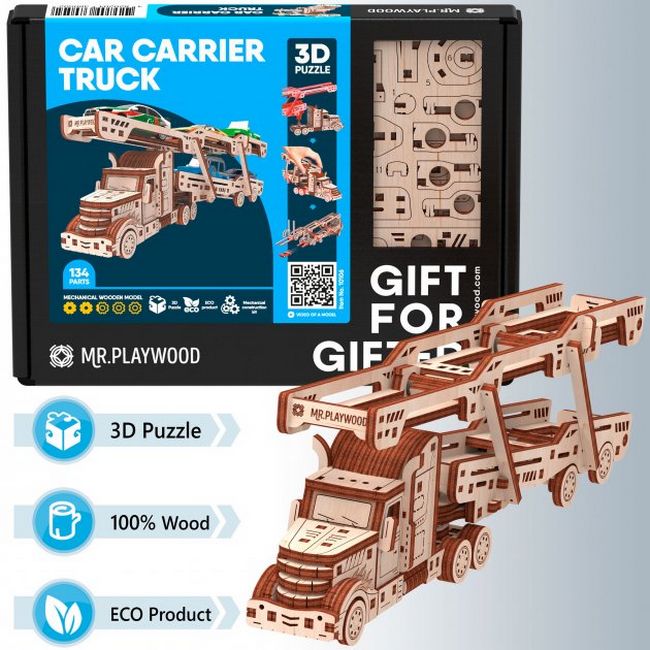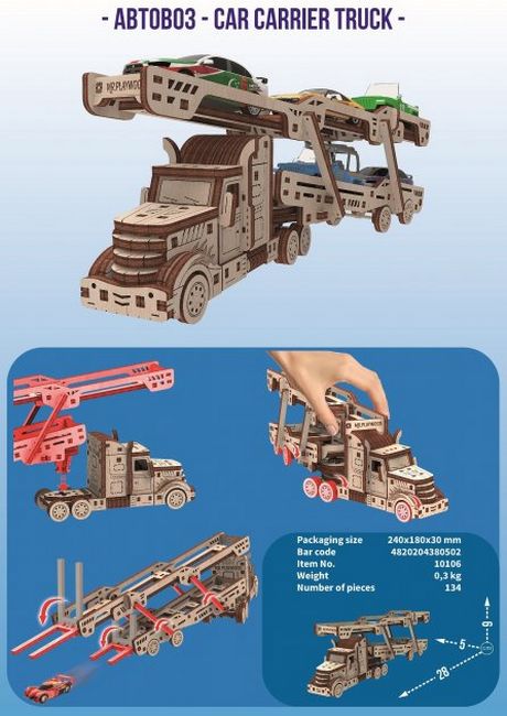Ця невелика модель причепа-автомобіля може стати улюбленою іграшкою вашої дитини. Але насамперед це комплект. Зберіть дерев'яну модель разом із дитиною відповідно до інструкції. Після цього Truck Auto Trailer готовий перевезти до 5 невеликих автомобілів у вибраний пункт призначення. Акуратно від'єднайте деталі від пластини та зберіть дерев'яний комплект без клею. Усі необхідні деталі входять у комплект. Збирайте та насолоджуйтесь незвичайним механічним 3D транспортом Mr.Playwood!