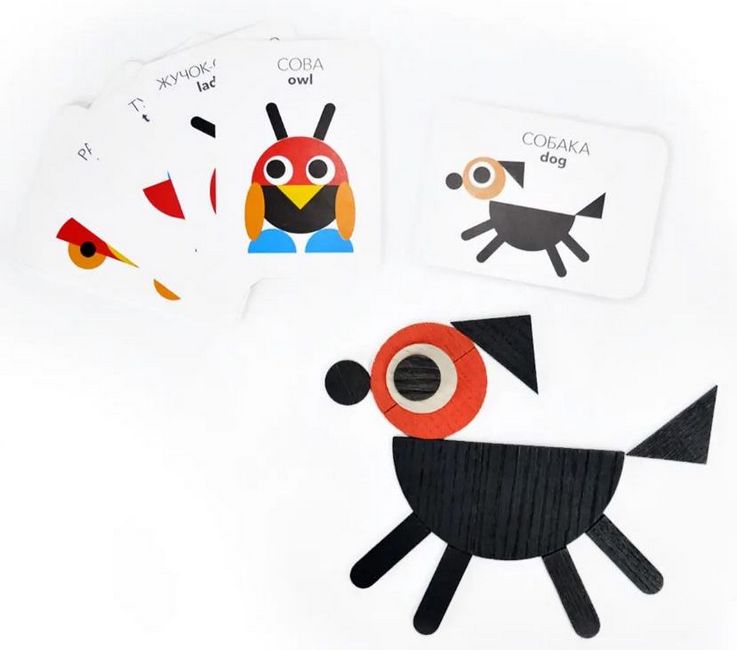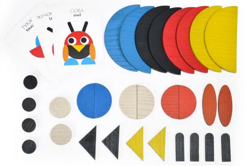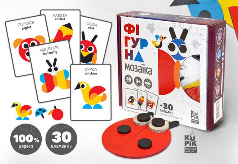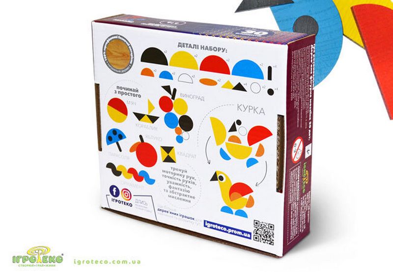 Супер-тренажер для дитячого мозку, пальчиків та фантазії - кольорова фігурна дерев'яна мозаїка складається з 30 елементів, з яких можна викладати стилізовані зображення тварин, рослин, предметів побуту, цифри і букви, геометричні форми, орнаменти.