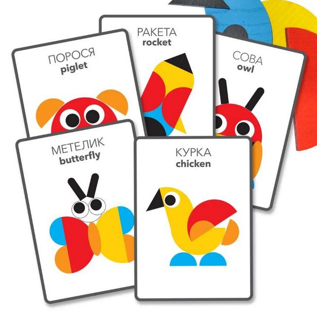 В наборі +10 двосторонніх кольорових карток з цікавими мозаїками, виклавши які, дитина зможе придумувати все нові й нові фігури.