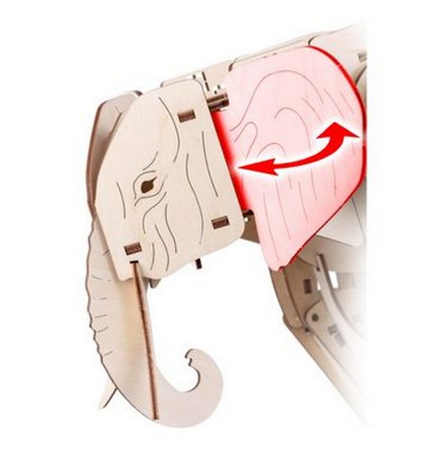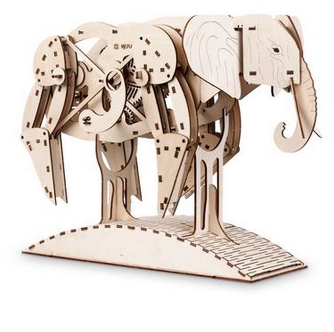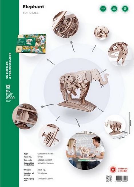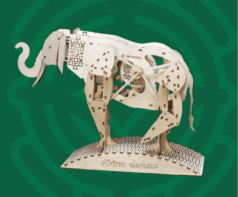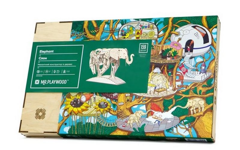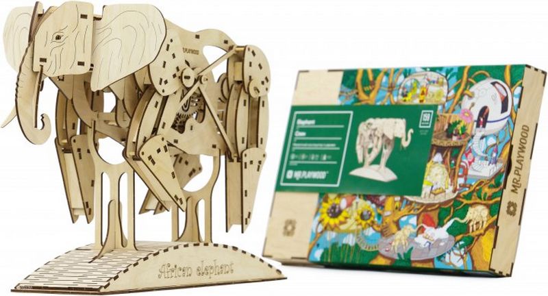 Механічний Слон Mr.Playwood – складна конструкція, що крокує за допомогою справжнього 4-ланкового механізму відповідно до природнього руху тварини-велетня. А ще Механічний Слон любить брати участь в марафонах і від задоволення ворушить вухами. Конструктор збирається з 159 високоякісних, вирізаних лазером дерев'яних деталей, які необхідно від'єднати від планшетів і зібрати без клею за інструкцією.