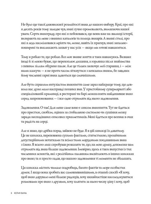 Провідний винний експерт Оз Кларк, як завжди, легко і з гумором говорить із читачами про найважливіші тонкощі вибору вина, а головне — про вміння по-справжньому насолоджуватися цим унікальним напоєм. Крок за кроком, з кожним розділом цієї книжки ви відкриватимете для себе світ вина з усіма його принадами. Почніть з основ (які бувають сорти винограду й стилі, у чому їх особливості і як орієнтуватися на мапі виноробних країн світу), тоді попрактикуйтеся (як правильно читати етикетку, де краще купувати вино, у що наливати і з якою їжею поєднувати) і нарешті — відчуйте себе справжнім фахівцем, засвоївши кілька простих правил дегустації та професійну лексику винолюба. У цій книжці немає сухих фактів і нотаток сноба-сомельє, вона більше нагадує приємну, корисну і не завжди серйозну розмову з обізнаним другом, який радо розділить з вами пляшку гарного вина.