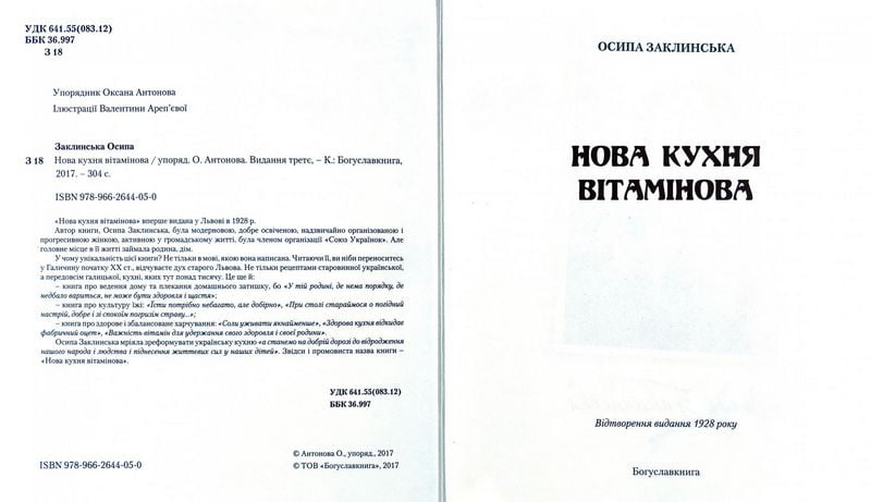 «Книжка надається на святочні, або новорічні весільні дарунки для молодих і старих господинь в місті і на селі» - писав часопис «Нова хата», рекламуючи у 1928 рік «Нову кухню вітамінову» Осипи Заклинської.