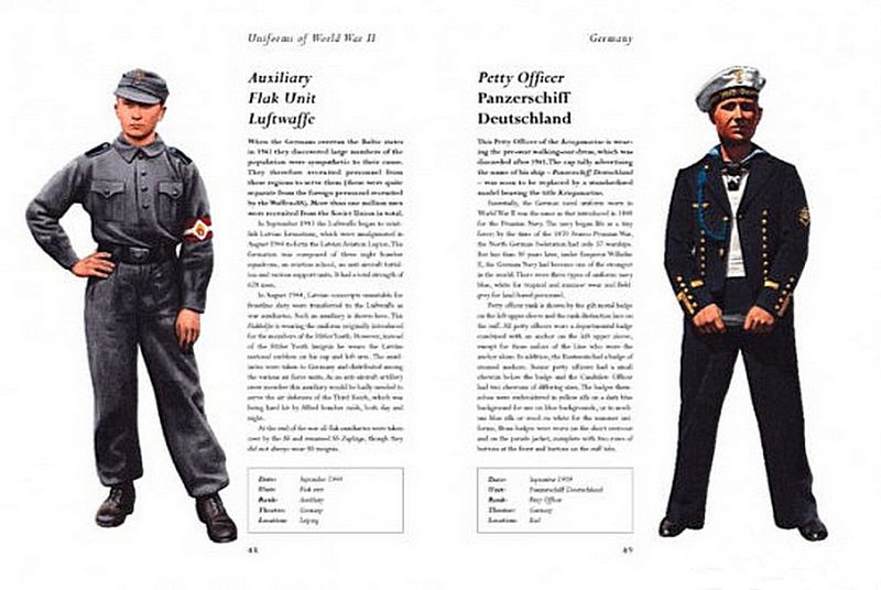 Entries are grouped by country and each uniforms is fully illustrated across a page. The many different varieties of badges and rank insignia of each national army are also shown and described in detail. Each artwork is accompanied by a description of what the figure is wearing and why, and the typical weapons and any other equipment the figure would have carried. For each entry, a specifications box gives date, unit, rank, theatre and location. Many of the artworks are based on famous individuals who fought in the war, and any interesting and `personal' adaptations to the unforms are shown.
