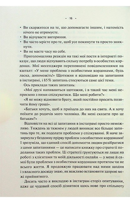 Чому нам так складно відмовляти, захищати власний простір і не жити для чужих очікувань? «Особисті кордони. Керівництво зі спокійного життя без травм і комплексів» — це чесна, глибока і водночас легка до читання книга, яка допоможе вам навчитись турбуватись про себе без почуття провини. Авторка показує, що мати межі — це не егоїзм, а любов до себе, і дає практичні інструменти для щоденного життя.