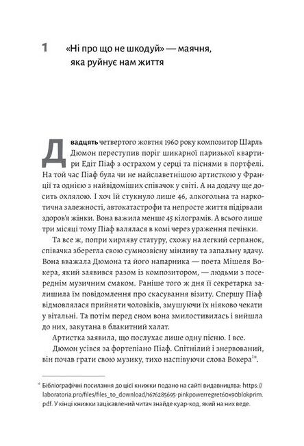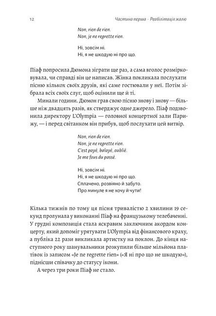 - Класифікує жалі, які ми відчуваємо, на чотири види — фундаментальні, моральні, жалі про брак сміливості і жалі за стосунками. Таким чином не тільки спрощує розуміння цієї емоції, а й демонструє, у якому напрямку нам рухатися, щоб змінити своє життя на краще.