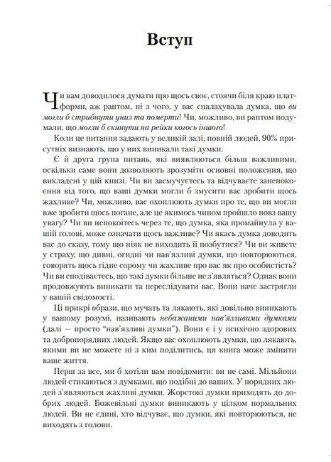 У вас бували колись думки, що лякають? Нав'язливі чи тривожні? Наприклад, коли ви погладили кошеня й подумали: "Я можу легко розтрощити йому голову". Або ви втішали друга, що пережив провал у особистому житті, й потай смакували принизливі деталі того, що він про це розповів. Чи їхали з родиною у автомобілі та у подробицях уявляли, як втрачаєте керування машиною та виїзджаєте на зустрічну смугу? Ці ганебні думнки виникають у всіх, і у розумних та добропорядних людей також.