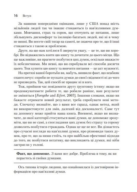 Добра новина: є чудовий спосіб позбутися страждать, що спричиняють такі думки. Перед вами посібник, у якому описаний підхід, заснований на практиці когнітивно-біхевіоральної терапії (КБТ). Ця книга допоможе засвоїти новий спосіб поводження з думками, коли більше не потрібно боятись чи соромитись їх. За допомогою цієї книги та технік, що в ній описані, читачі навчаться поступово приборкувати цих "биків" у своїй голові.