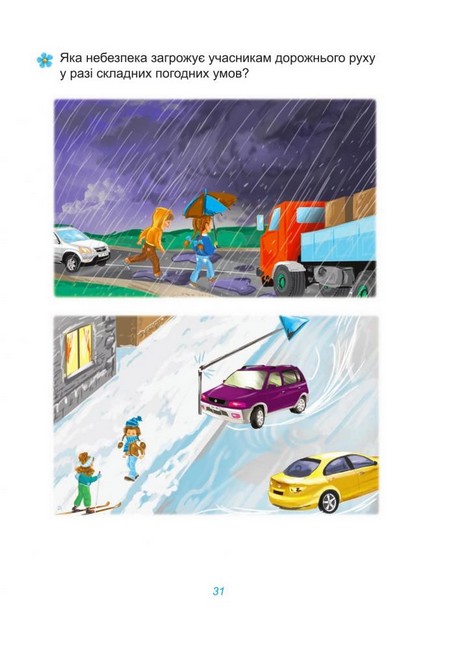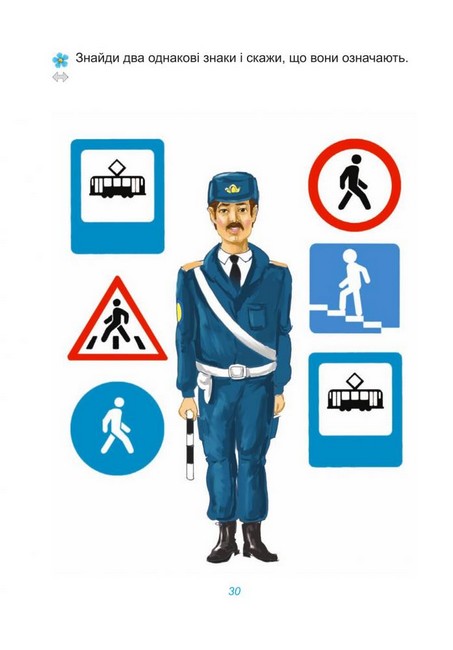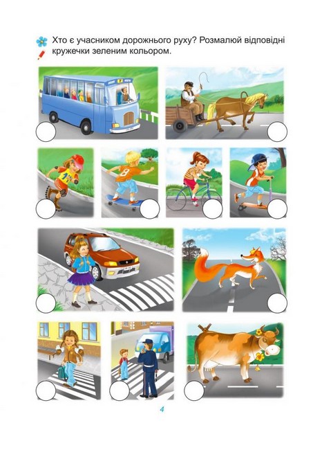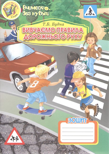 Зошит-посібник призначений для вивчення правил безпечної поведінки дітей на вулицях і дорогах. Він містить малюнки, практичні завдання, цікаві вправи. Запропоновано кольорову вкладку для виготовлення аплікацій “Світлофор”, “Пішохідний перехід”, матеріал для складання пазлів “Автомобіль” і дорожнього знака “Пішохідний перехід” та гру-доміно “Дорожні знаки”.