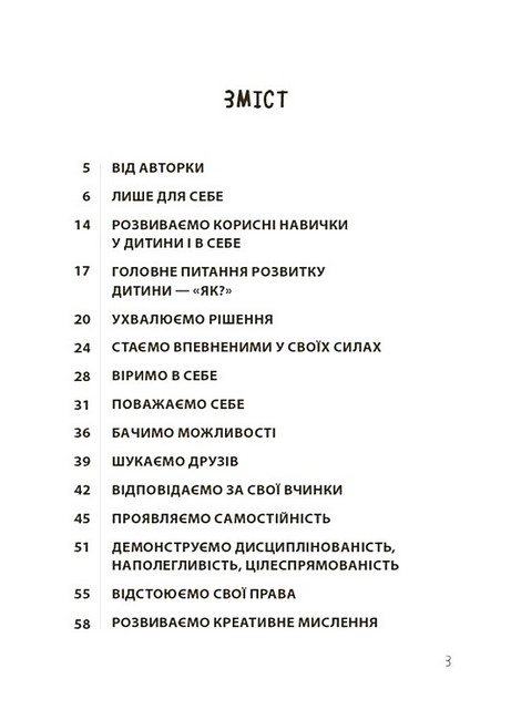 Кожен розділ книжки присвячений окремій навичці. Задля їх формування наведено: життєву ситуацію з виховним змістом; рекомендації та корисні поради від психолога; питання для аналізування; місця для нотаток для роботи над собою та із дитиною.