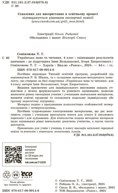 Посібник відповідає Типовій освітній програмі, розробленій під керівництвом Р. Б. Шияна, та є складовою навчально-методичного комплекту, що створено на базі підручника «Українська мова та читання» для 4 класу авторів Інни Большакової, Ігоря Хворостяного.Видання призначено для індивідуального виконання завдань учнівством у межах формувального та рівневого оцінювання, дозволяє визначити рівень оволодіння учнями і ученицями навчальним матеріалом, виявити освітні труднощі та спланувати подальшу індивідуальну абогрупову педагогічну підтримку.