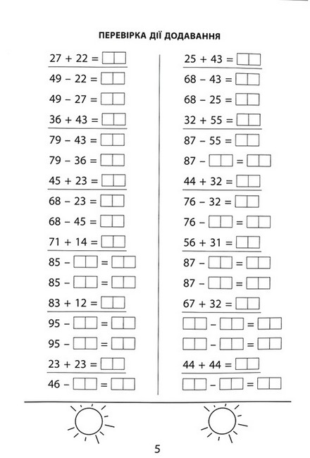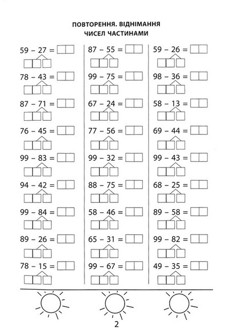 У цьому посібнику подано завдання з математики для відпрацювання обчислювальних навичок учнів 2 класу. Робота над матеріалом посібника дає можливість довести практичні навички дітей із обчислювання до автоматизму. Тренувальний зошит є універсальним, його можна використовувати як доповнення до будь-якого підручника з відповідної навчальної дисципліни. Матеріал, вміщений у ньому, можна застосовувати для індивідуальної і фронтальної роботи та роботи вдома. Видання призначене для вчителів початкових класів, школярів та їхніх батьків.