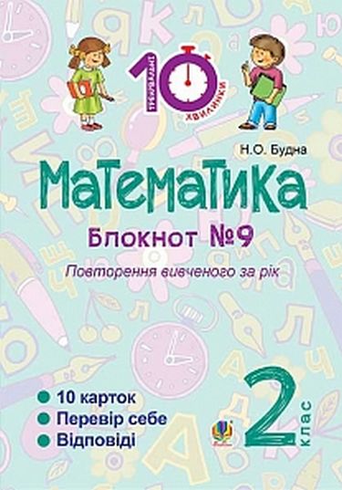 Пропонований посібник входить до серії 9-ти блокнотів «Тренувальні 10-хвилинки», мета яких — закріпити обчислювальні навички та вміння розв’язувати рівняння, нерівності, задачі учнями 2-го класу. Блокнот містить картки з вправами та завданнями, розрахованими на 10-хвилинне виконання, а також підсумковий контроль знань «Перевір себе» з навчальної теми та відповіді для самоперевірки. Посібник зручний у використанні. Працювати з ним можна не лише в школі чи вдома, а й під час подорожі, відпочинку на природі. Для учнів 2-х класів, учителів та дбайливих батьків.