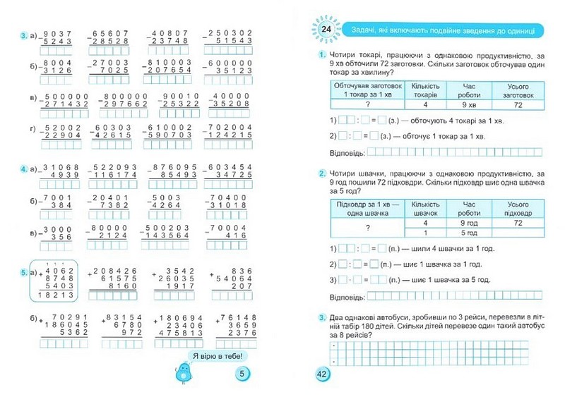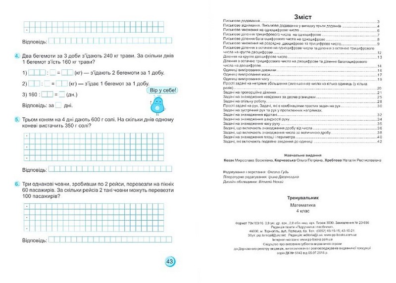 Посібник містить завдання з математики, виконання яких допоможе четвертокласникам удосконалити обчислювальні навички та закріпити вміння розв?язувати програмові задачі. До всіх завдань є відповіді.
