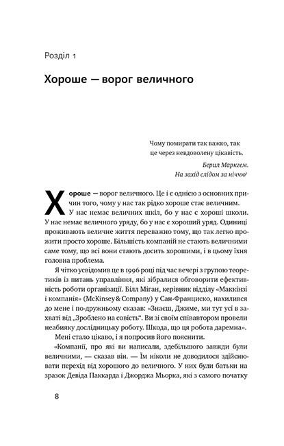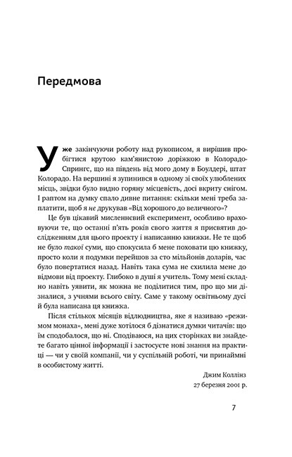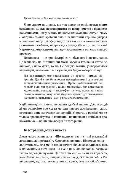 «Від хорошого до величного» — це результат п’ятирічного дослідження, у якому Джим Коллінз з командою проаналізували сотні компаній, щоб відповісти на одне просте, але глибоке запитання: чому лише деякі з них стають по-справжньому великими? Книга не дає модних порад — вона відкриває закономірності, що справді працюють. Ретельні дані, яскраві приклади, інсайти, які можна застосовувати у будь-якому бізнесі або навіть особистому розвитку.