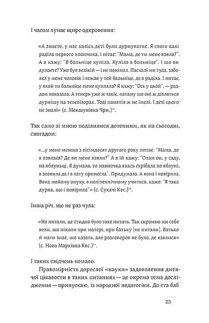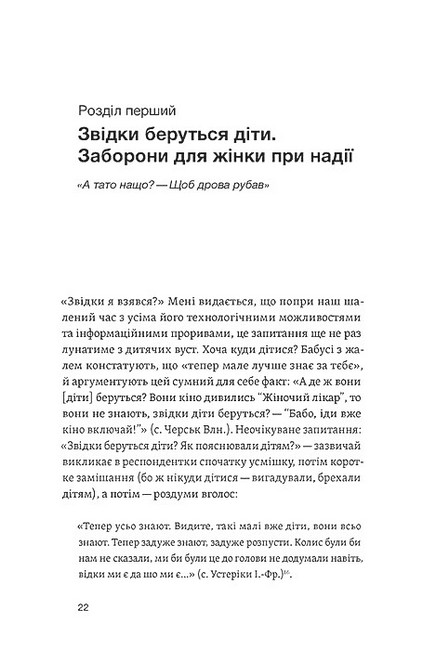 У книжці зібрано нотатки з етнографічного поля про історію повсякдення, у якому ритуальні дії, прикмети, молитви, замовляння та заборони ще впливали на навколишній світ. Живі оповіді жінок про власний, з бабів-прабабів переданий, досвід народження дитини відхиляють завісу над незбагненним актом початку нового життя.