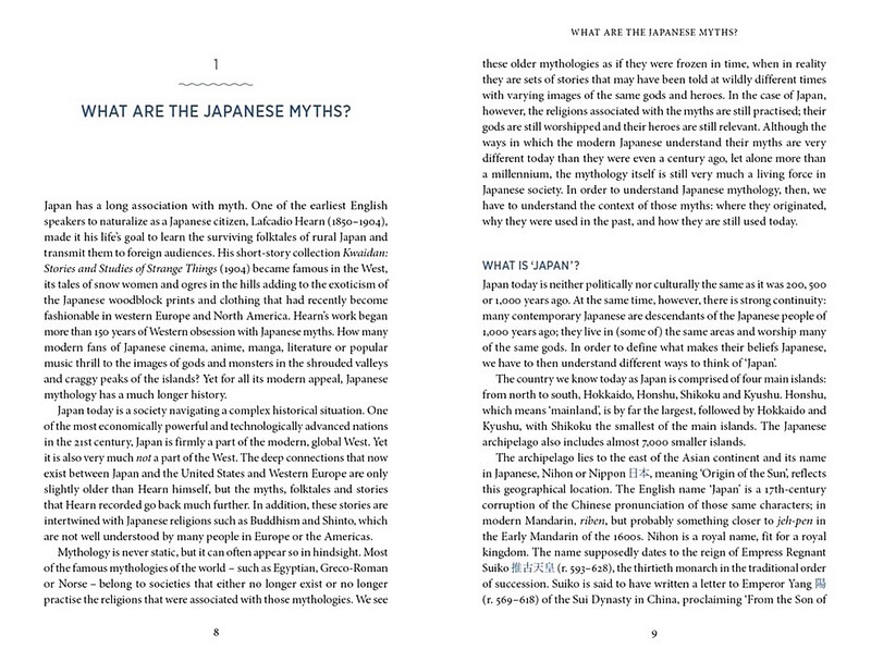 Це розумний і стислий путівник по багатій традиції японської міфології, від найдавніших записаних легенд про Ідзанагі та Ідзанамі, їхніх божественних нащадків і створення Японії, до середньовічних казок про мстивих привидів і до сучасної реінкарнації стародавніх божеств як героїв меха-аніме. Хоча багато хто в усьому світі любить японський культурний експорт, мало хто знайомий з унікальною міфологією Японії, збагаченою синтоїзмом, буддизмом і регіональним фольклором.