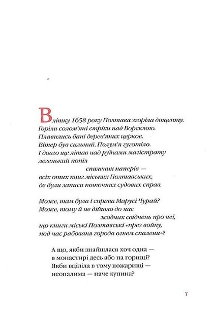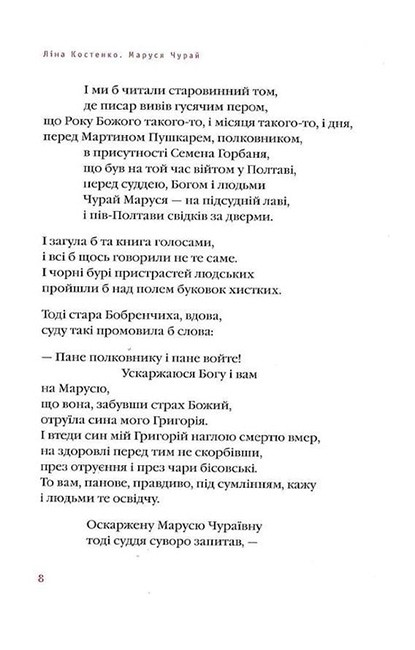 Історичний роман у віршах «Маруся Чурай» визначної української поетеси Ліни Костенко — один із вершинних творів української літератури, своєрідна енциклопедія духовного життя нашого народу в XVII ст. Висока драма любові вирує на тлі епічних історичних змагань, де доля легендарної Марусі Чурай тісно переплетена з долею України.