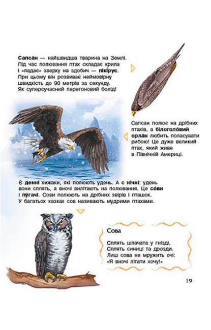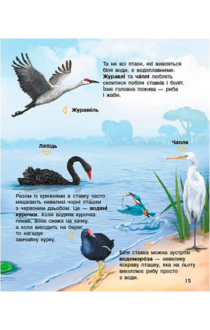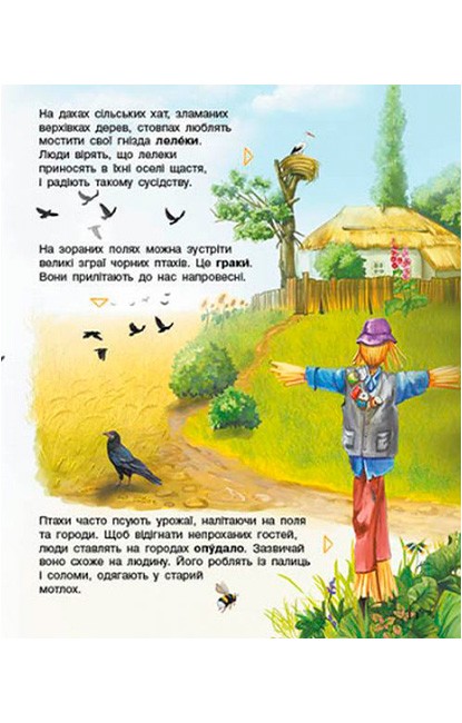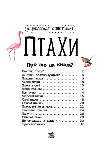 Тут поєднано захопливий контент і дружній тон: малюк легко запам’ятовує назви птахів, дізнається, де вони живуть і що люблять. Інформація подана у формі маленьких історій і фактів, які легко запам’ятовуються. А барвисті малюнки зроблені так, ніби птахи ось-ось злетять зі сторінок!