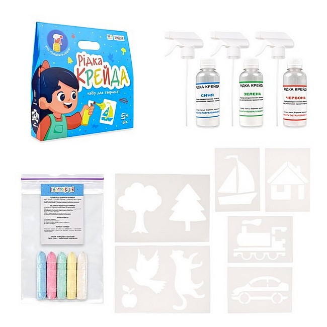 Комплектація: пляшки з сумішшю — 3 шт., інструкція — 1 шт., зіп-пакет — 1 шт. крейда — 5 шт., тригер — 3 шт., трафарети — 6 шт.