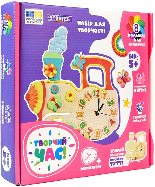 Набір для творчості «Творчий час. Парозик Тутті» — це чудова можливість створити свій власний унікальний годинник. Він стане прикрасою дитячої кімнати та допоможе малюку вивчити час. У наборі на вас чекає дерев'яна основа паровозика, годинниковий механізм, а ще повітряна маса та фломастери для прикрашання.