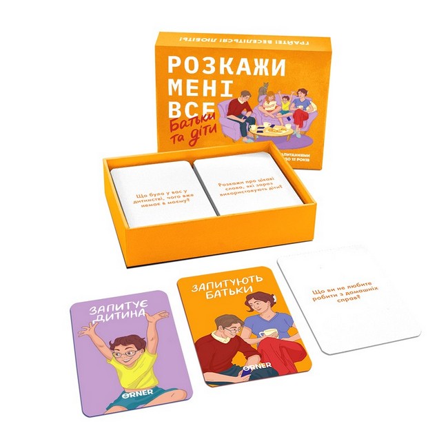 Розмовна гра «Розкажи мені все. Батьки та діти» — 150 кроків до взаєморозуміння та побудови здорових, довірливих відносин між батьками та дітьми. Усе, що треба — діставати картки та бути готовими до чесного діалогу. Це чудова можливість побудувати діалог із дітьми та відкритись одне перед одним. У цій грі є 150 карток із запитаннями, що поділені на 3 категорії: батьки, діти та загальне. Тобто, відповідати на запитання будуть усі.