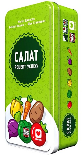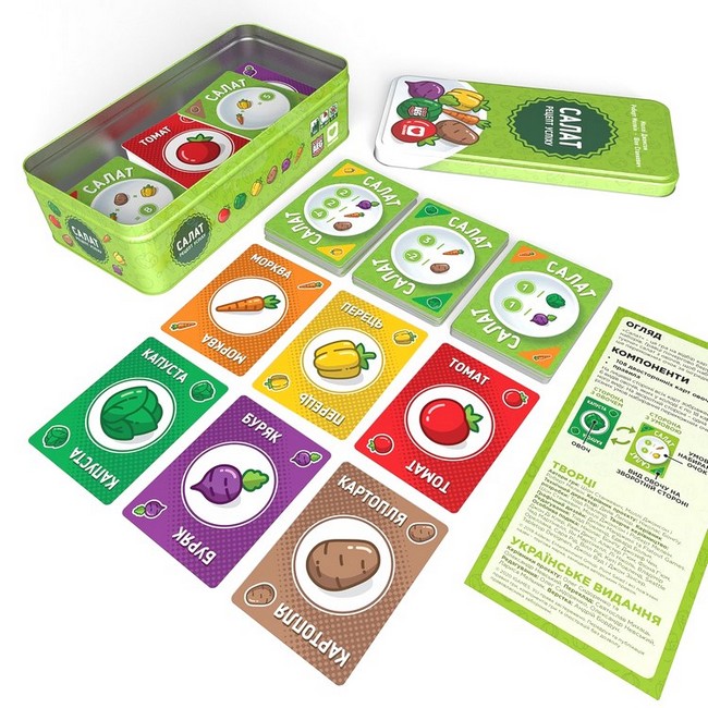 Салат – це швидка і захоплююча карткова гра для всієї родини. У ній є понад 100 способів набрати переможні очки. Гравці можуть використовувати різні стратегії, і кожна нова партія буде неповторною!