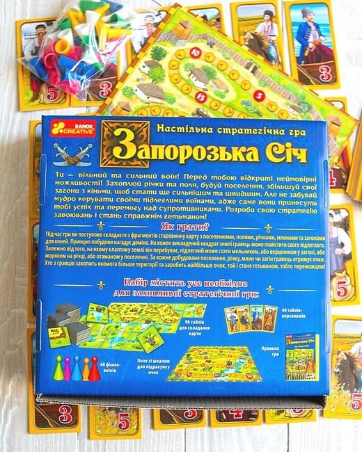 «Запорозька Січ» — стратегічна настільна гра, що переносить тебе у серце героїчного козацького світу. Тут ти не просто гравець — ти справжній воїн, який будує, завойовує й управляє! Прагнеш стати гетьманом? Тоді час скласти власну стратегію і довести свою майстерність!