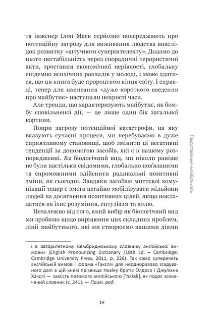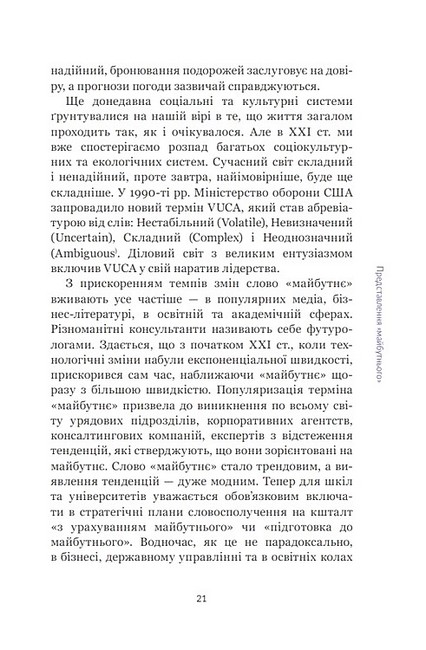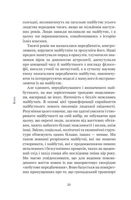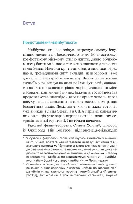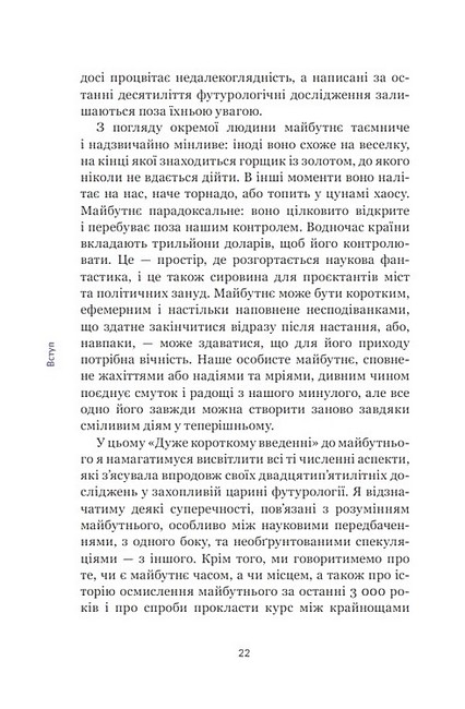 У теперішній час технологічних інновацій та бурхливих змін поняття майбутнього і його конкретні характеристики цікавлять практично кожного. Книга Дженніфер Ґідлі «Майбутнє», яка вже отримала світове визнання серед теоретиків і практиків футурології, має на меті ґрунтовно ознайомити із цим колом питань. Прочитавши її, кожен зможе зробити аргументовані висновки щодо того, чи є майбутнє єдино можливим та прогнозованим, а чи, навпаки, — існує безліч потенційно можливих майбутностей, реалізація кожного з яких залежить від наших поглядів, настановлень та дій. Д. Ґідлі наводить переконливі аргументи на користь ідеї множинних майбутностей. Своєю книгою вона намагається вивільнити й демократизувати ці майбутності, вкладаючи важелі керування ними в голови й руки теперішніх свідомих громадян. На широкому історичному й соціокультурному тлі, творцями якого є не лише філософи та науковці, а й ворожки, утопісти, мрійники, техноідеологи і навіть роботи зі штучним інтелектом, авторка намагається налаштувати наше мислення на уявлення і втілення людиноцентричних, а не техноцентричних майбутностей. Її книга — це потужна протидія банальності, тривіальності та маніпуляціям, які побутують в інформаційних спекуляціях на тему майбутнього, спрямованих на широкий і надмірно довірливий загал.