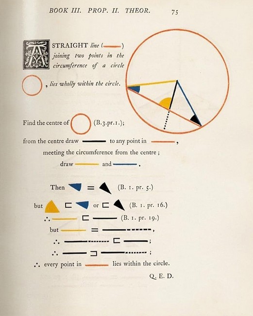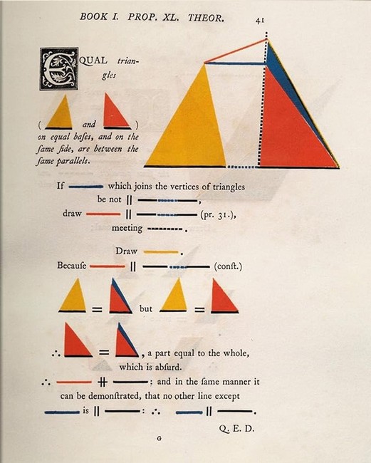 Майже за століття до того, як Мондріан прославив геометричні лінії червоного, жовтого та синього, математик XIX століття Олівер Бірн застосував цю кольорову схему у своєму виданні 1847 року математико-геометричного трактату Евкліда «Начала». Ідея Бірна полягала у використанні кольору, щоб полегшити навчання та «поширювати сталі знання». Результат був описаний як одна з найдивовижніших і найкрасивіших книг XIX століття.