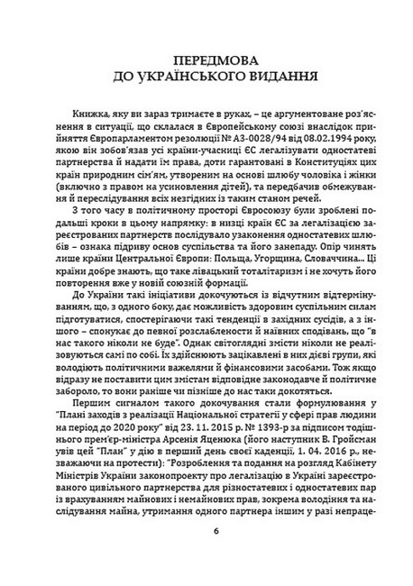 Ця книжка є роз’ясненням ситуації, що склалася в ЄС внаслідок ухвалення резолюції, яка зобов’язує усі країни-учасниці легалізувати одностатеві партнерства й надати їм права, доти гарантовані природним сім’ям, утвореним на основі шлюбу чоловіка і жінки.