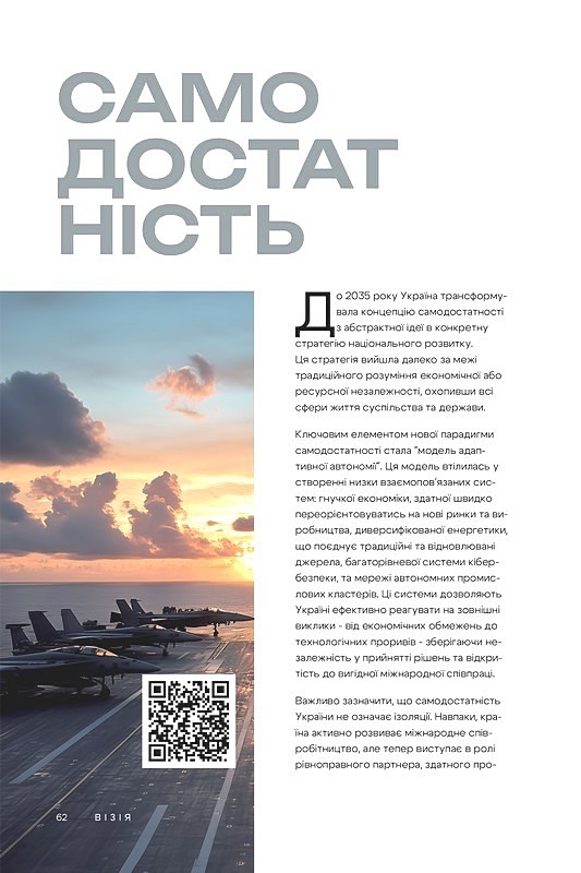 Представлена робота є комплексним дослідженням перспектив розвитку України до 2035 року і містить детальний аналіз потенційних трансформацій у ключових сферах держави: безпеці, економіці, соціальній політиці, технологіях та культурі. В основі дослідження лежить концепція побудови сильної, інноваційної держави, що базується на принципах справедливості, свободи та людської гідності.