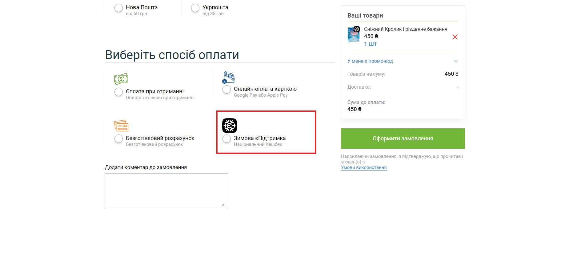 УВАГА! Для оплати карткою національного кешбеку необхідно додати до кошику ЛИШЕ ті товари, які приймають участь у державній програмі. Вони позначені іконкою зимової Є-Підтримки