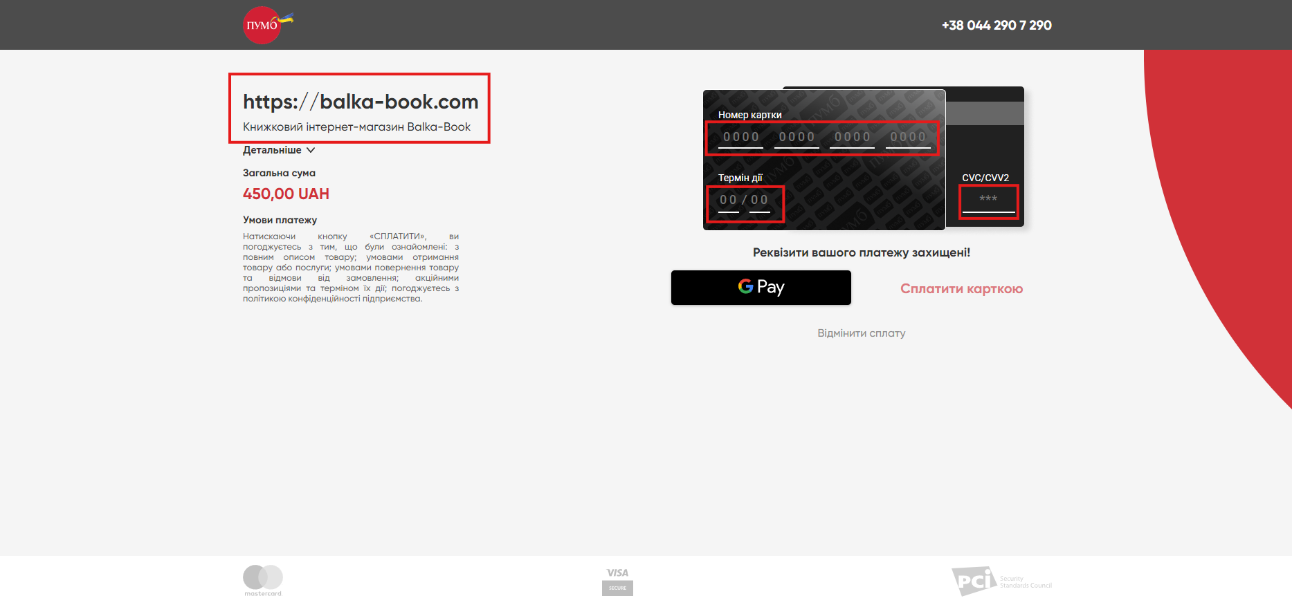7. УВАГА! Вас було перенаправлено на сторінку банку. Вкажіть у відповідних полях данні від картки Національного кешбеку. Знайти їх можна у Вашому онлайн-банкінгу. Для оплати потрібні ті самі данні, як і при оплаті звичайною карткою: Номер картки (16 цифр), Термін дії (4 цифри формату Місяць/Рік), Код безпеки CVV(3 цифри на оберті картки). Після введення цих данних натисніть кнопку "Сплатити карткою". Ваш банк, де ви оформили картку національного кешбеку, може попросити підтвердити платіж. Це може бути у вигляді коду в СМС або за допомогою додатку. Пройдіть підтвердження та завершіть оплату замовлення.