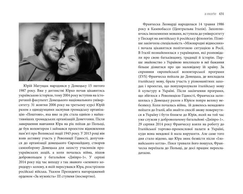 Роман побудовано на реальних подіях та написано зі згоди Франчески Леонарді. Авторка висловлює подяку історику Андрію Портнову за безцінну допомогу в роботі над романом. На обкладинці використано фото Франчески Леонарді.Після невдалих спроб пошуку щастя в рідній Італії й Англії молода італійка Франческа вирушає до екзотичного Донецька вчити російську мову. Непривітне місто швидко відлякує дівчину, яка вже готова повернутися до сонячної Італії, якби не зустріч із Юрієм. Він не лише пробуджує у Франчески сильні почуття, а й знайомить її з українським Донецьком, про існування якого італійка навіть не здогадувалась. Не в змозі розлучитися з хлопцем, вона опиняється в епіцентрі боротьби за місто під час Євромайдану. Та найбільша її боротьба точиться за почуття Юрія і їхнє спільне майбутнє, яке повсякчас затьмарюється новими викликами й небезпеками.