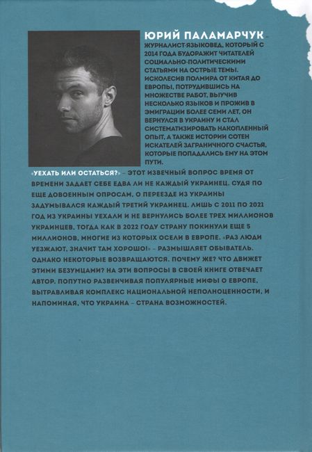 "СУДЯ ПО ЕЩЕ ДОВОЕННЫМ ОПРОСАМ, О ПЕРЕЕЗДЕ ИЗ УКРАИНЫ ЗАДУМЫВАЛСЯ КАЖДЫЙ ТРЕТИЙ УКРАИНЕЦ. ЛИШЬ С 2011 ПО 2021 ГОД ИЗ УКРАИНЫ УЕХАЛИ И НЕ ВЕРНУЛИСЬ БОЛЕЕ ТРЕХ МИЛЛИОНОВ УКРАИНЦЕВ. ТОГДА КАК В 2022 ГОДУ СТРАНУ ПОКИНУЛИ ЕЩЕ 5 МИЛЛИОНОВ. МНОГИЕ ИЗ КОТОРЫХ ОСЕЛИ В ЕВРОПЕ. «РАЗ ЛЮДИ УЕЗЖАЮТ, ЗНАЧИТ ТАМ ХОРОШО!» - РАЗМЫШЛЯЕТ ОБЫВАТЕЛЬ. ОДНАКО НЕКОТОРЫЕ ВОЗВРАЩАЮТСЯ. ПОЧЕМУ ЖЕ? ЧТО ДВИЖЕТ ЭТИМИ БЕЗУМЦАМИ? НА ЭТИ ВОПРОСЫ В СВОЕЙ КНИГЕ ОТВЕЧАЕТ АВТОР. ПОПУТНО РАЗВЕНЧИВАЯ ПОПУЛЯРНЫЕ МИФЫ О ЕВРОПЕ. ВЫТРАВЛИВАЯ КОМПЛЕКС НАЦИОНАЛЬНОЙ НЕПОЛНОЦЕННОСТИ, И НАПОМИНАЯ, ЧТО УКРАИНА - СТРАНА ВОЗМОЖНОСТЕЙ."