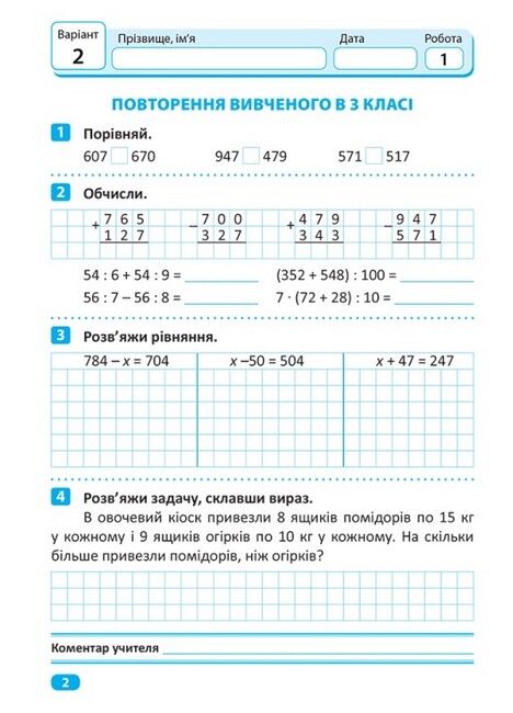 Посібник містить 16 індивідуальних робіт з математики у двох рівноцінних варіантах для спостереження вчителем за процесом сприйняття та розуміння учнями навчального матеріалу. А також для вчасного виявлення труднощів у засвоєнні певних тем і їх подальшого більш детального опрацювання.