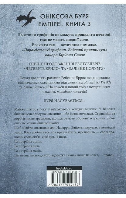 «Оніксова буря» — третя частина захопливого циклу «Емпіреї» від Ребекки Яррос, яка підкорила серця читачів у всьому світі. Це історія про відвагу, боротьбу з темрявою і кохання, що кидає виклик долі. У новій книзі розгортаються ще більш драматичні події: таємниці, що довго залишалися прихованими, виходять на світло, а герої мають протистояти силам, які прагнуть знищити їхній світ. Це кульмінація пристрастей, магії та випробувань, де кожне рішення стає вирішальним.
