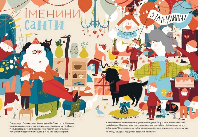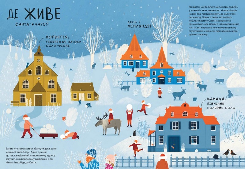 Кожна дитина знає, хто такий Санта-Клаус, однак мало кому відомо, як і де саме він мешкає, чим захоплюється і що полюбляє на сніданок. А в цій святковій книжці таких подробиць безліч! Маленькі читачі й читачки також дізнаються про невтомних помічників Санти ельфів, його підприємливу дружину пані Клаус та вірних північних оленів.