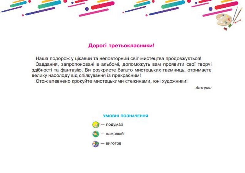 Зміст альбома відповідає чинним типовим освітнім програмам, які розроблені під керівництвом О.Я. Савченко та Р.Б. Шияна. Завдання сприятимуть формуванню ключових, міжпредметних та предметних мистецьких компетентностей учнів відповідно до вимог освітньої галузі «Мистецтво» Державного стандарту початкової освіти. Особливий інтерес у посібнику становлять нестандартні творчі завдання, цікавий пізнавальний матеріал. Це робить урок емоційно забарвленим, дозволяє третьокласникам сприймати теоретичні відомості доступно й легко. Шаблони, кольорові вкладки, зразки робіт дадуть змогу дітям виконати роботу естетично і творчо.