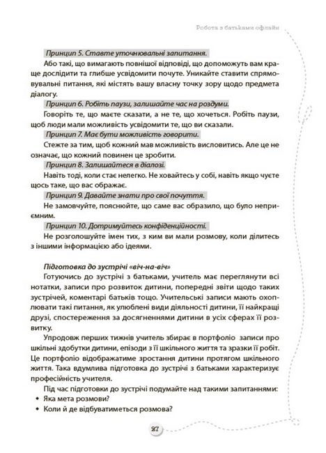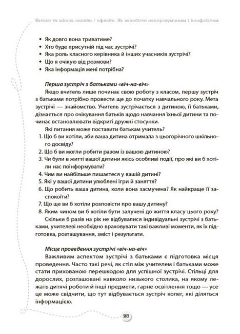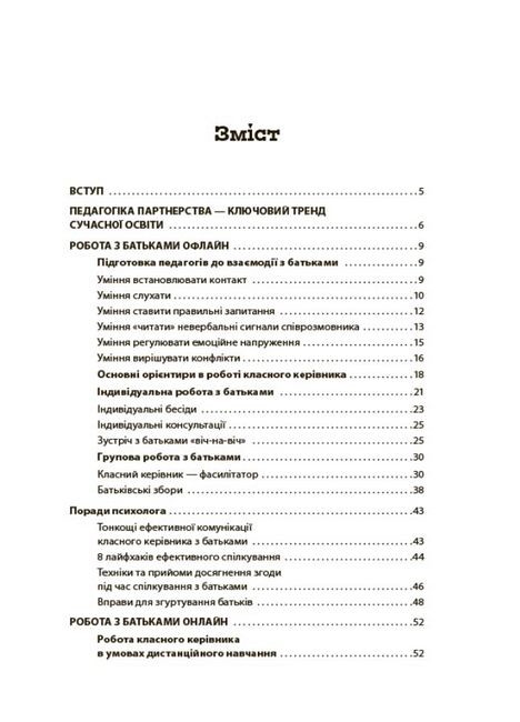 Ми створили покрокові алгоритми підготовки й проведення індивідуальних та групових бесід з батьками на зустрічах офлайн, а також особливості роботи з батьками в інклюзивному класі. Головний акцент у посібнику зроблено на онлайн-комунікаціях: email-листування, viber чати, Zoom, Skype, Google Мeet та інші месенджери та застосунки в освітньому і виховному процесі.
