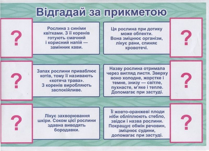 З давніх-давен люди знали і використовували цілющі властивості рослин. У наш час лікарські рослини широко використовуються у медицині: сушені трави, настоянки, таблетки і мікстури. Природа України надзвичайно багата на цілющі рослини. Їх можна знайте усюди: у лісі, на полі, біля оселі - навіть не здогадуючись, що під ногами справжній скарб, здатний дарувати людині здоров'я. Тому треба знати лікарські рослиниі вміти розумно їх використовувати. Демонстраційний матеріал складається з 16 кольорових карток із зображенням лікарських рослин і цікавою й корисною інформацією про них на звороті та 7 цікавих ігор для розвитку та закріплення вивченого матеріалу, пам'яті, уваги, логічного мислення.