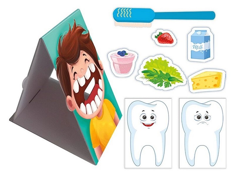 4 цікаві ігри в одній коробці! Ця яскрава, розвивальна гра допомагає малюкам з 3 років у легкій та веселій формі зрозуміти важливість правильного харчування і щоденної гігієни порожнини рота. Ваша дитина навчиться відрізняти корисні продукти від шкідливих, дізнається, як правильно чистити зубки та буде грати з користю для здоров’я!