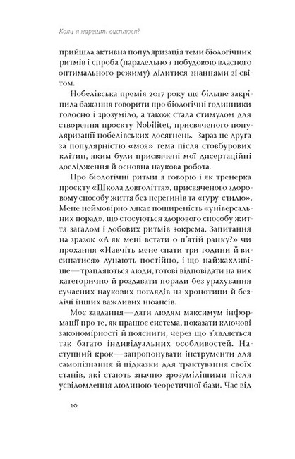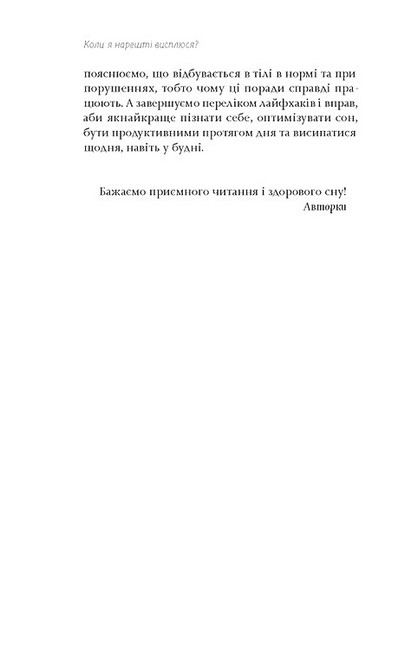 Коли я нарешті висплюся? Це питання ми ставимо собі роками, переконуючи самих себе в тому, що ось уже незабаром (після школи/іспитів/роботи/на старості) налагодимо цей процес. Переконуємо себе так, наче в цьому є щось складне, а у нас — необмежений запас часу. Погані й гарні новини разом: часу в нас мало, але, на щастя, у наших біологічних ритмах немає жодної магії. Сон і біологічний годинник, за яким ми живемо, — хай які складні в роботі механізми, та все ж їх можна налаштувати. Достатньо лише зрозуміти, як усе це працює. Саме ці процеси у книжці «Коли я нарешті висплюся? Як засинати і прокидатися із задоволенням» пояснюють біологині Ольга Маслова та Ніка Бєльська.