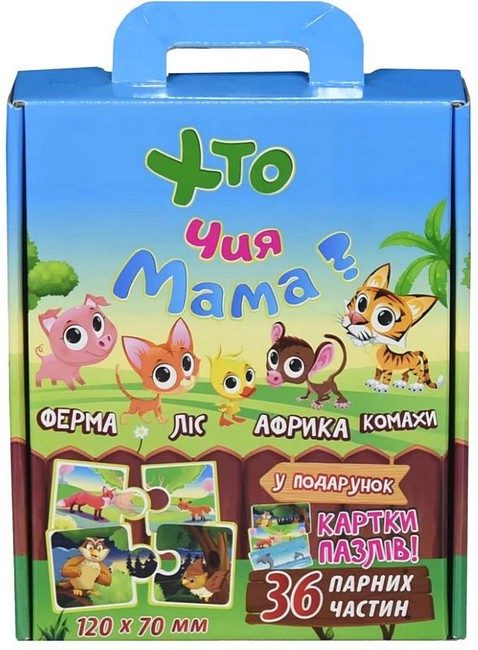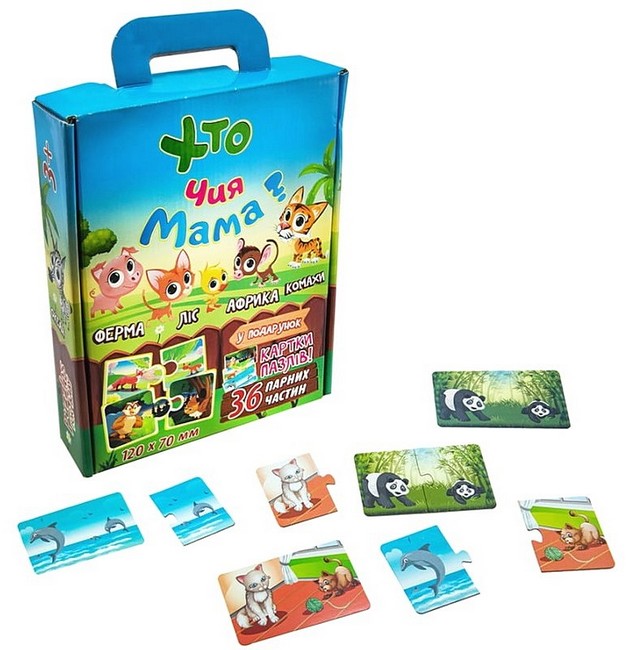 Загалом у наборі 36 міні-пазлів, що складаються з двох частин – необхідно підібрати кожній мамі її дитинча. Щоб допомогти малюку в комплекті, є картки з готовими картинками.
