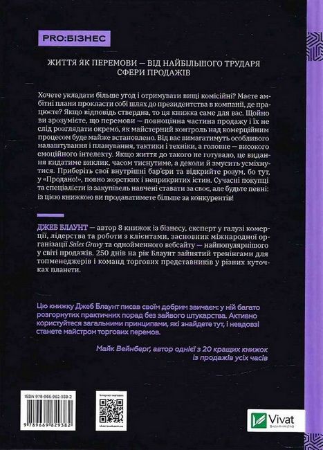 Хочете укладати більше угод і отримувати вищі комісійні? Маєте амбітні плани прокласти собі шлях до президентства в компанії, де працюєте? Якщо відповідь ствердна, то ця книжка саме для вас. Щойно ви зрозумієте, що перемови — повноцінна частина продажу і їх не слід розглядати окремо, як майстерний контроль над комерційним процесом буде майже встановлено. Від вас вимагатимуть особливого налаштування й планування, тактики й техніки, а головне — високого емоційного інтелекту. Якщо життя до такого не готувало, це видання кидатиме виклик, часом тиснутиме, а деколи й змусить усміхнутися. Приберіть свої внутрішні бар’єри та відкрийте розум, бо тут, у «Продано!», повно жорстких і неприкритих істин. Сучасні покупці та спеціалісти із закупівель навчені стояти на своєму, але будьте певні: із цією книжкою ви продаватимете більше за конкурентів!