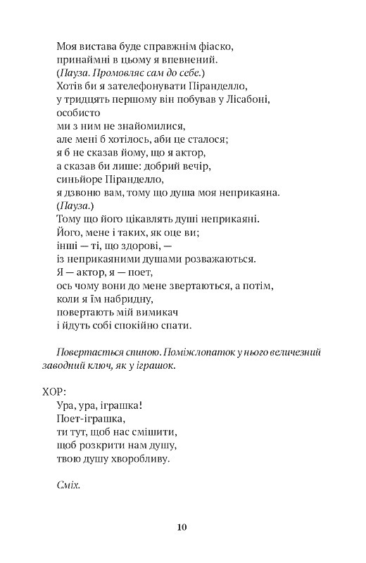 Телефонний апарат, за допомогою якого актор-невдаха, який грає роль Фернандо Пессоа, мріє довірити свої страхи й тривоги Луїджі Піранделло («Синьйора Піранделло просять до телефону»); в лікарняній палаті б’ється у відчаї чоловік, що переживає непоправну втрату близької людини («Час тисне»)... В обох цих п’єсах одним із героїв є загадковий девтерагоніст, чиясь неможлива або недосяжна присутність, що водночас є відсутністю. «Той, другий» (відповідно привид чи труп) сприймається як предмет бажання і як супротивник, котрий своєю смертю уникнув вирішального, смертельного поєдинку. Однак через «того, другого» монолог протагоніста намагається збагнути власну суть і впіймати хоча б осколок своєї особистості у розбитому дзеркалі буття.